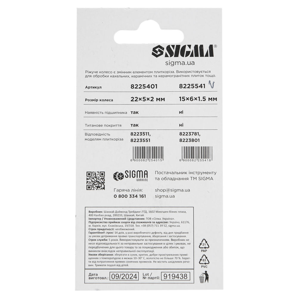 Колесо режущее для плиткореза 15×6×1.5мм SIGMA (8225541)