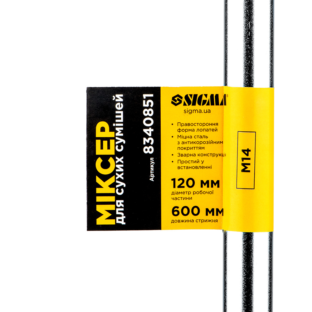 Миксер для сухих смесей М14 120×600мм SIGMA (8340851) - металева насадка з лопатями, призначена для інтенсивного перемішування сухих, густих та важких будівельних сумішей, таких як штукатурка, шпаклівка, цементні розчини, плитковий клей та піщано-гравійні суміші.